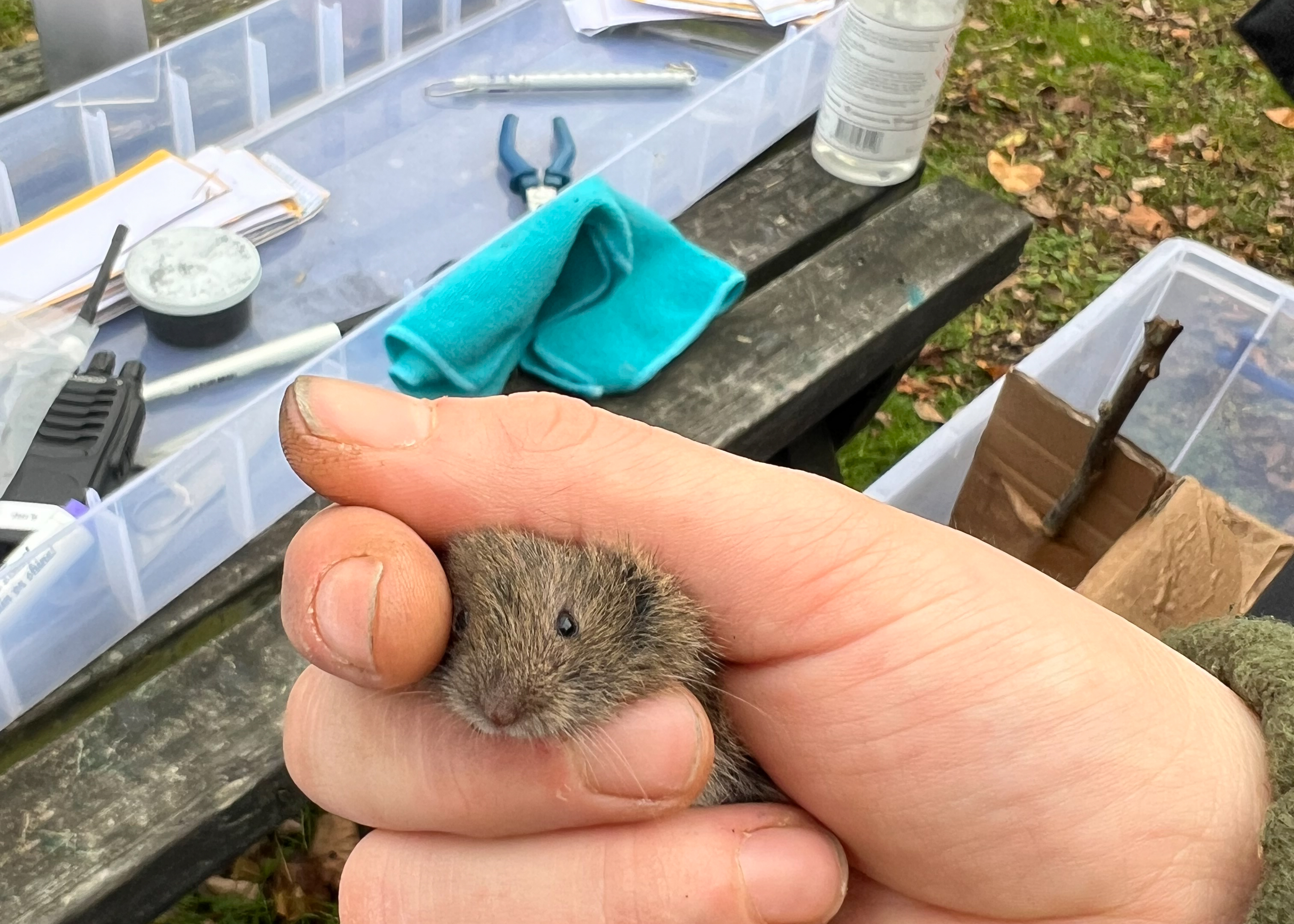 The animals are trapped during the day only, using a Longworth trap filled with plenty of hay and food. They are handled briefly to sex and weigh them then gently encouraged through the footprint tunnel before being released.